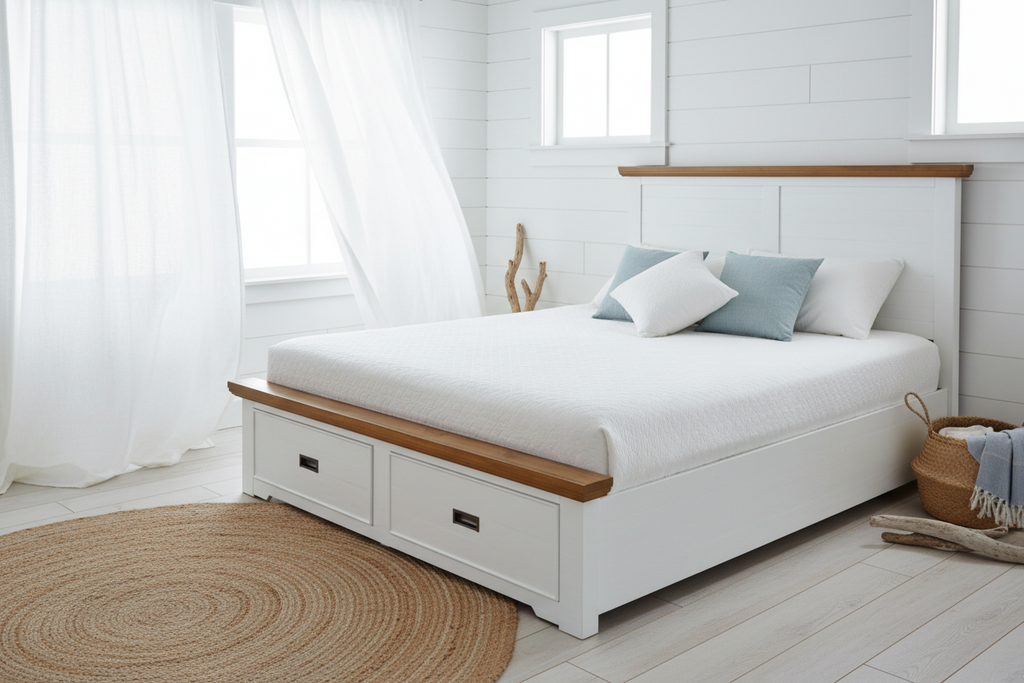Inspired by relaxed coastal living, the Marlow Bed Frame showcases clean lines, soft tones, and refined detailing. The combination of crisp white and warm brown timber creates a fresh, airy look that suits both contemporary and traditional interiors.