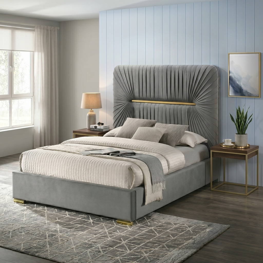 • Majestic Headboard: A towering headboard, adorned with golden accents, creates a dramatic focal point.